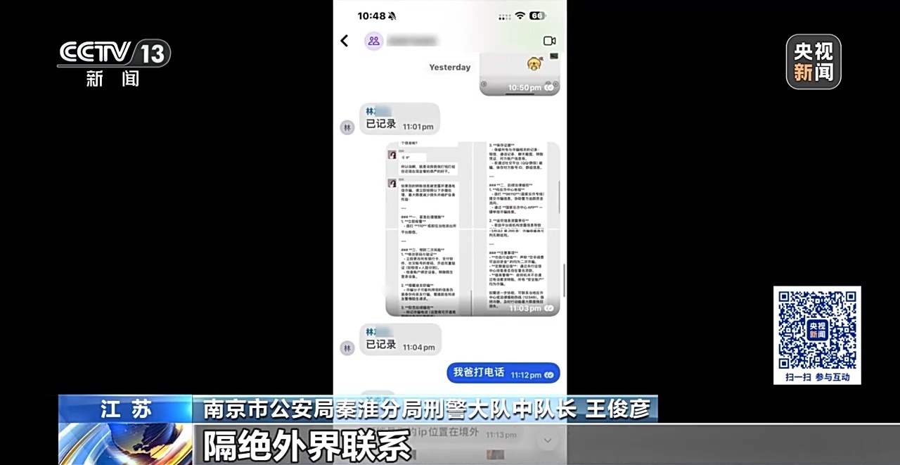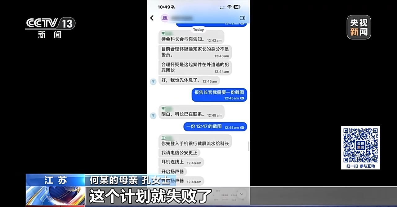 何某的母亲 孔女士:不能告诉任何人,强调的就是不能告诉任何人,如果说你告诉任何人的话,这个计划就失败了,他还说你就有可能会被逮捕,或者是被遣送回国。我所有的截图说话,他全部截图给骗子,然后让骗子告诉他应该怎么样去面对家长,怎么样去消除家长的疑虑。